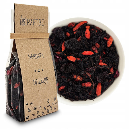 Herbata Dziękuje to wykwintna herbata, nawet dla wymagających smakoszy. Idealny prezent, kiedy pragniesz podziękować najbliższej osobie. Subtelny aromat wiśni i witaminy zawarte w jagodach Goji, to doskonałe połączenie z czarną aromatyczną herbatą. Herbata poprawi nastrój, pomoże się zrelaksować i będzie dobrym wyborem na Świąteczne kolacje. Napar tej herbaty może być dobrym dodatkiem do deserów, kiedy chcemy ugościć przyjaciół w świąteczny czas.