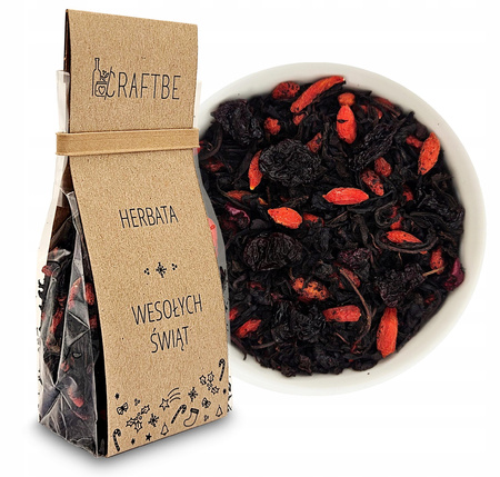 Wesołych Świąt to wykwintna herbata, nawet dla wymagających smakoszy. Subtelny aromat wiśni i witaminy zawarte w jagodach Goji, to doskonałe połączenie z czarną aromatyczną herbatą. Herbata poprawi nastrój, pomoże się zrelaksować i będzie dobrym wyborem na Świąteczne kolacje. Napar tej herbaty może być dobrym dodatkiem do deserów, kiedy chcemy ugościć przyjaciół w świąteczny czas.