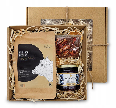 Rzemieślnicza kawa ziarnista CRAFTBE - Dziki Dzik , konfitura Borówka Amerykańska Tradycyjna, rzemieślnicza czekolada z liofilizowaną truskawką, suszone plastry pomarańczy 2szt, piękne opakowanie z naturalnym wypełnieniem udekorowane jutowym sznurkiem z zawiązaną kokardką.